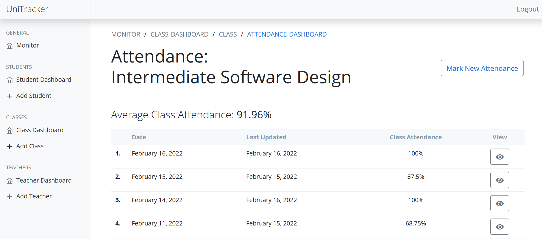 4. View attendance home page for the class, containing the average class percentage for the class and a table of all attendances recorded.