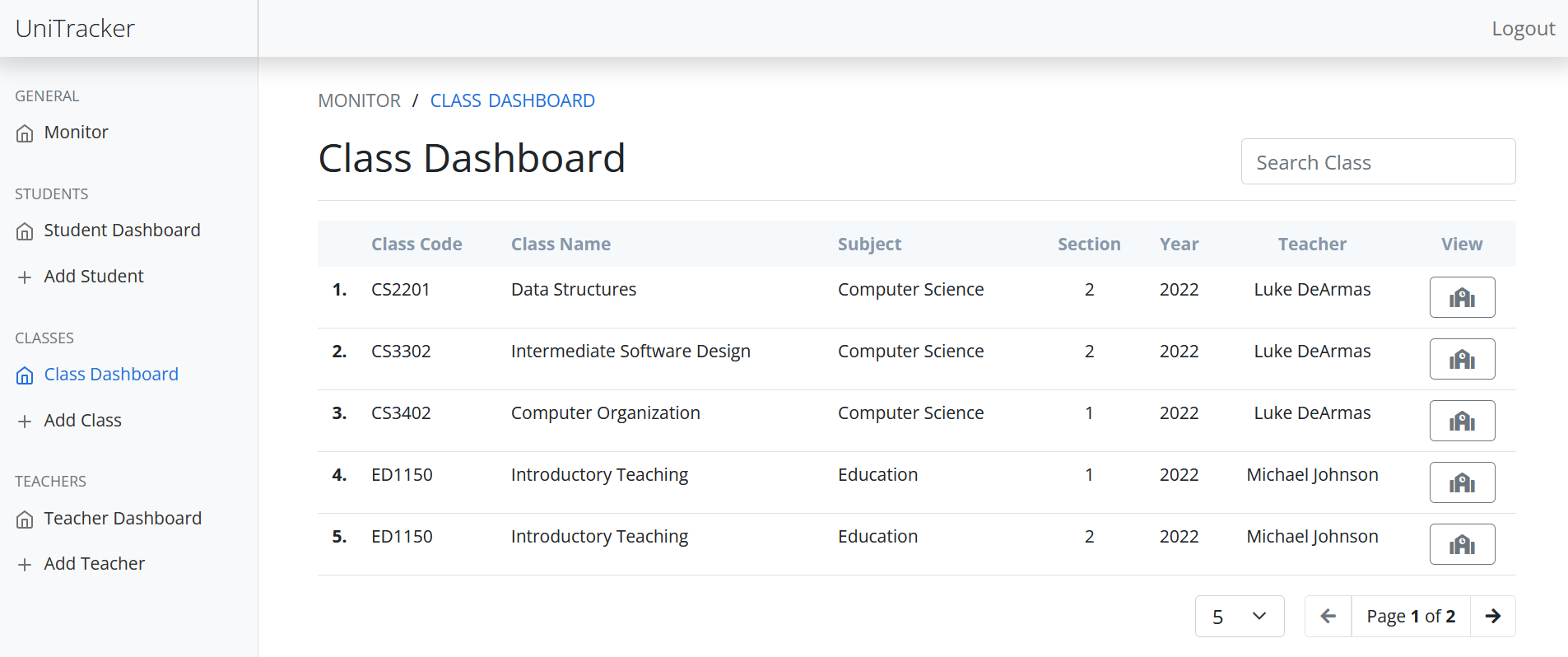 2. Search bar for student, class, and teacher tables (this works in conjunction with client side pagination when it is used).